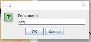 String name = JOptionPane.showInputDialog(b1, "Enter name: ");